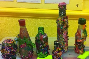 • you can choose a variety of decoration to glue on the bottles: sequins, scrap paper, crepe paper, leaves, beads, pieces of ribbon; you can cut very short pieces of wool and let the children feel them and glue them on the bottles