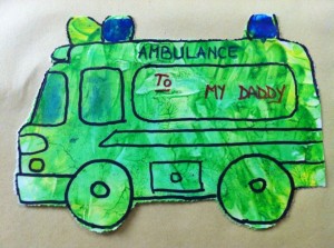 • you cut around the drawing (bottom, sides, but when you come to the top you leave some parts uncut, so that the ambulance picture holds onto the other half of the paper. ie I left uncut the blue lights on the top.