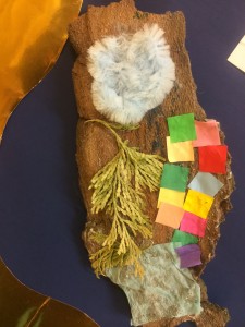 During a trip in the park I collected some Bark that was about to fall off the trees. The next day, at school, I told the children we have new natural materials and they created their own piece of art. They look really lovely!