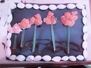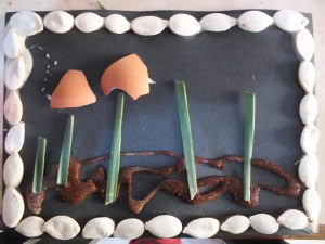 Once you made the pumpkin seeds frame, you can put some random glue at the bottom of the page and then sprinkle some nutmeg/cinnamon/coffee ground; turn the page over to get rid of the excess of the ground cinamon, but do it slowly, as the pumpkin seeds are not completely stuck. Glue some very simple stems (mine are daffodils leaves actually). We dont concentrate on a beautiful design, but on the mosaic effect. The ‘petals’ are gonna be made from pieces of egg shells that you can beak in advance (not too small, kind of a quarter of a half shell). At the top of the stem put some glue, then put the egg shell on the top of it.