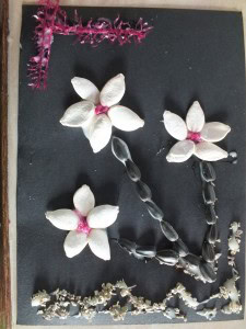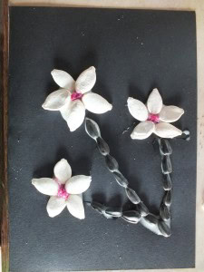 Glue the pumpkin seeds one by one to make a flower and then glue the sunflower seeds as for the stems.