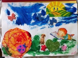 I do love to recycle and I am using everything possible to make sure we used everything we could before we throw things away. Again, a very simple Summer collage where I used some cut out pictures from magazines and I let the children create a summer landscape. When they glued their favourite pictures, they had the option to paint some bits of the collage, thus using 2 techniques: gluing and painting.