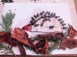 Start glueing the sunflower seeds with the pointed bit upwards to symbolise the spikes and keep on doing it until you cover the hedgehog.