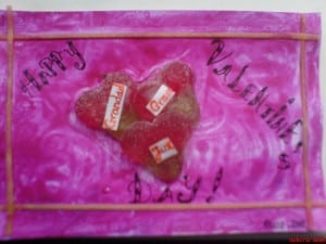 2. Paint the paper pink using pink paint and glue 50:50. Don’t let it dry, glue the jelly hearts/or other shapes, as many as it fits for the purpose (this card was from a child to his gran and grandad, so we used 3 hearts). Then, you can put some spagetti to crate the feeling of a frame, they will automatically glue. Warning: the jelly hearts dry very slow, so you either wanna make the card in advance, or you don’t place it in an envelope for a while. The children had fun, especially seeing that they can create nice, sweet things with their favourite jellies