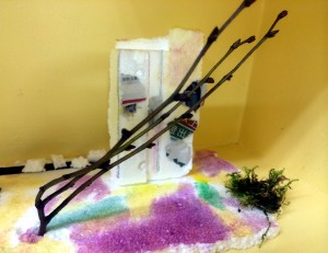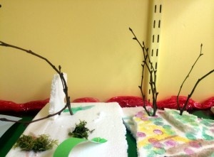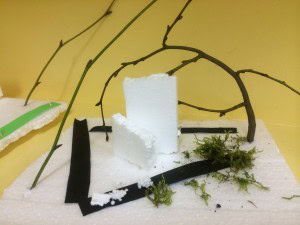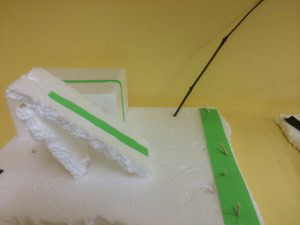 You may also want to simply push down into the polystyrene some sticks that sand for the trees in the town and also glue some moss on an area to symbolize a park.