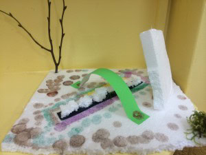 First, you tear off some 30/20cm polystyrene size pieces that will stand for the floor, then some other 10/7cm ones that will stand for the buildings in the city. When you want to put the floor and the buildings together you will have to use toothpicks (or fast action glue if your children are old enough to use it!). You insert 3/4 of 2 toothpicks in the edge that will make contact with the floor and then you push the 10/7 cm piece into the big one, until you get a stable grip. The toothpicks will keep together the building to the town-floor. You can put as many buildings you want in your town, different sizes and shapes. We stopped at 1 or 2, as the children I’m working with are very young. Using half a toothpick, you place one end of the paper band into the floor, you lift the middle of the paper up to create a bridge, then you use another half toothpick to place the other end of the paper band in the floor. YOu created a bridge that can be over a stream or over another road, whichever you choose (it gives even more of an idea of a 3D town). Using this technique of paper bands and half toothpicks you can create lots of roads, crossroads, etc.