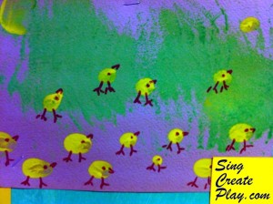 • using the child’s index, they make finger prints for chicks: the child dips his index in yellow paint and prints it on the paper. If older children, they can use all their fingers, so they will have different sizes of chicks.